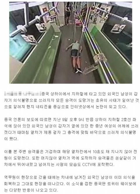저거 중국인들이 저리 된게 중국이 보험이라했나 그런게 안되있어서 만약 저런 사람을 병원에 데려다 주면 환자말고 데려다준 사람이 돈내야 할ㅇ경우도 있다고 함 그래서 저렇게 됐다던데.. 그래도 119같은거 불러주지