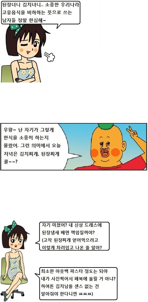 잘비꼬았네ㅋㅋㅋㅋㅋㅋ근데 부탁인데 김치녀까지는 그래 이해한다.한국녀라고 싸잡아서 욕먹이지좀마라.성폭력 난무하는데 여자가 남자더러 성폭력에대해 어떻게생각하냐고 사과하라고하면 기분좋겠냐?시발 남자라곤 사겨본적도없는데 졸지에 된장녀,김치녀취급받으면 기분 진짜 더럽다.내주변친구들도 다 착하고 좋은애들인데 걔네들도 똑같이 평가당하고 그런 취급 받아야되는게 웃기지도 않는다.