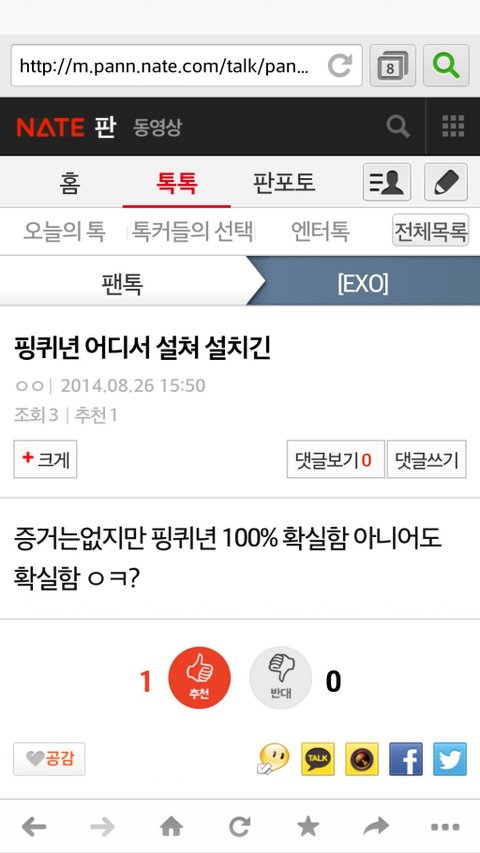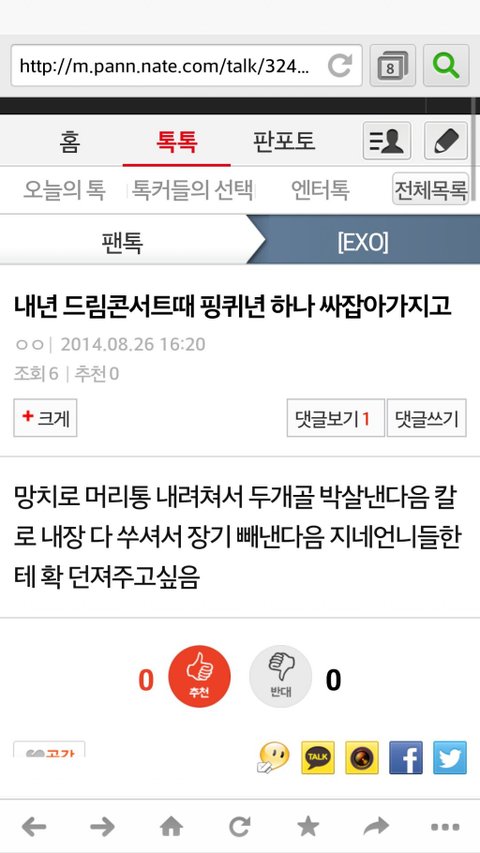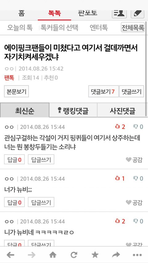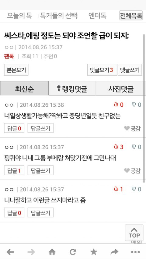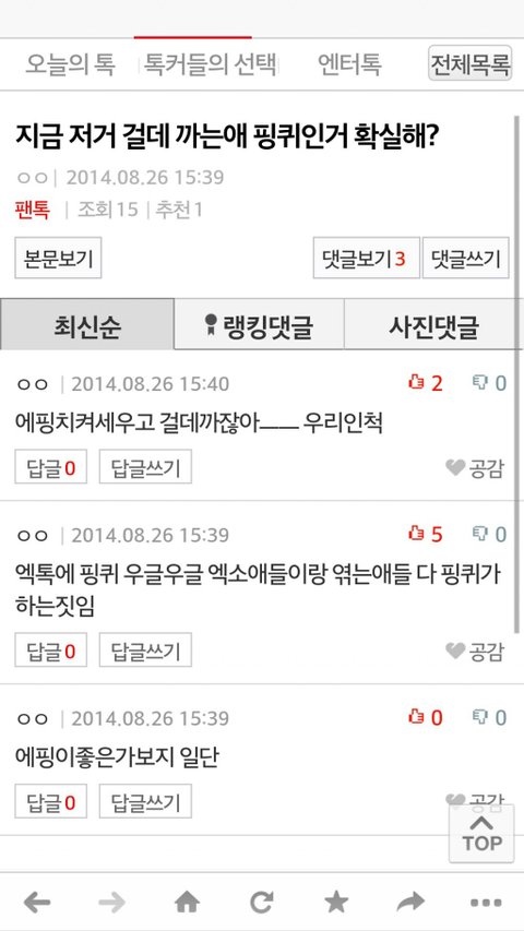 어떤 관종 하나가 엑톡에서 걸스데이를 깠다는데 그걸 핑팬의 짓으로 몰아가고 증거도없이 몰아붙이고 심지어는 악담까지 퍼붓더군요 수위를 넘는덷 정도가있냐고 항의하니까 논란이 되니까 팬코다,엑팬들은 안그런다 정상적인 팬들의 소행이 아니다 라는글로써 해명을 하는데 추천수는 괜히 있겠나요 이걸 널리 보시길 바랍니다 정말 당당한듯이 행동하는말투,개념을 좀 밥말아먹은거 같네요