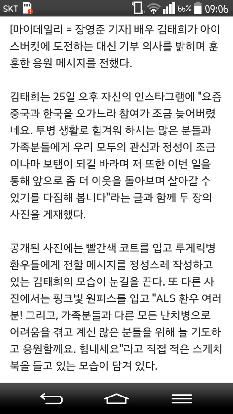 요즘 많은 연예인들이 이 캠페인의 본질을 잊고 그냥 얼음물 맞고 깔깔거리고 얼굴 한번 더 비추거나 인맥자랑하거나 향후 활동계획 홍보하는 등의 수단으로 이용하는 경우가 꽤 있는 듯 싶고 점점 캠페인의 참 의미는 변질되고 결여되어지는 것 같았는데 김태희는 톱스타든 누구든 남들 대부분 얼음물 붓고 있지만 소신껏 기부를 택하고 진심으로 응원메시지 전함.. 각자 생각이 다 다르겠지만 난 역시 뭔가 다른거 같고 좀 더 개념 차 보였음..