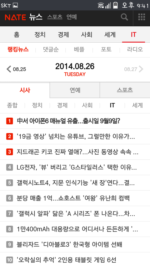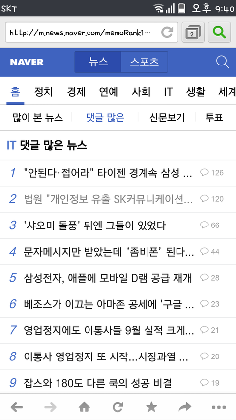 첫 사진은 오늘자 네이버 댓글 많은 뉴스 IT섹션이다. 보다시피 sk컴즈가 개인정보 유출에 대한 배상책임이 없다는 연합뉴스 기사가 2위에 랭크되어 있다. 그런데 네이트는 어떤가? 바로 아래 사진은 네이트 랭킹뉴스 IT섹션이다. 없다. 네이버에 올라와 있는 기사가 여기는 올라와 있지도 않다. 기사를 찾고 싶으면 네이버에서 기사제목을 복사해 검색을 해야 찾을 수 있다. 게다가 연관된 뉴스 검색어인 'sk 컴즈' 혹은 'sk 커뮤니케이션'으로 검색시 아무런 뉴스도 뜨지 않는다. 정말 치졸한 짓이다.