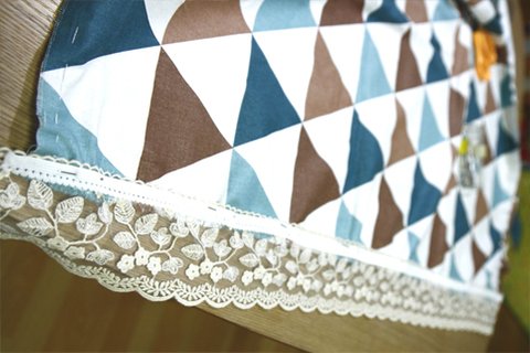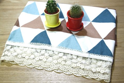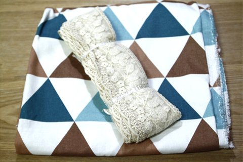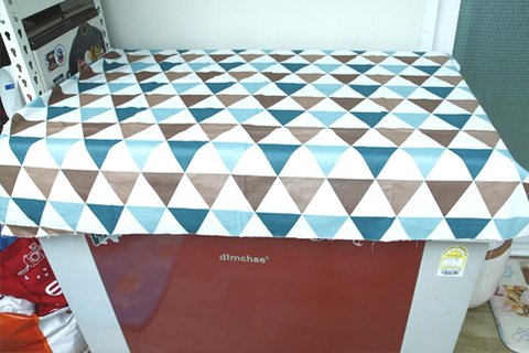 어때요? 좀 더 가을과 잘 어울리는 느낌이죠? 우리집 김치냉장고의 변신하는 과정을 공개합니다! 1. 먼저 커버를 만들 천과 기타 준비물을 준비해주세요.(저는 가을 분위기와 어울리는 삼각형 모양이 그려진 천과 레이스를 준비했답니다.^^)