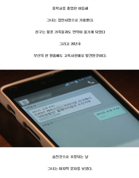 저번에 판에 올라온 고독사한뒤에 처리해주는 처리반? 그런 판 올라왔었는데 고독사하고나서 죽은걸 알아주는사람이없어서 결국엔 시체썩은냄새가 퍼져서 그집에 가보니 죽어있었단 일도 있고 썩은시체에 구더기가 생겨서 시체가 훼손되고 이웃간의 정이 사라진게 진짜 맞는듯 싶다.