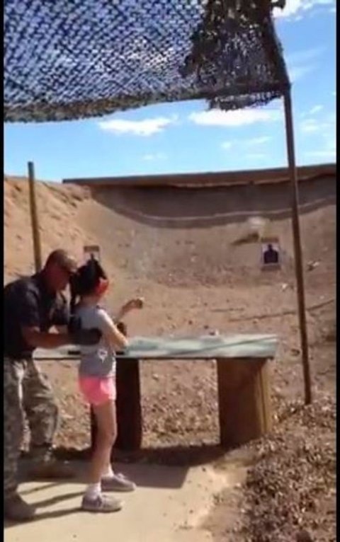 소녀가 우지 기관총 쏘다가 반동을 이기지 못하고