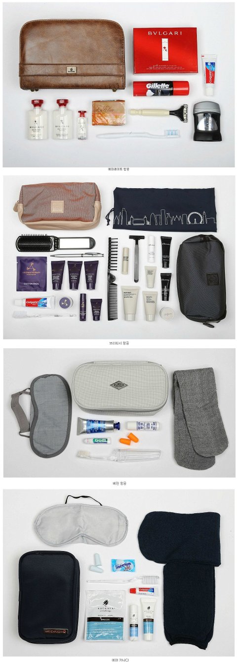 저런거 일등석만 주는걸로 앎..대한항공은 일등석타면 갈색 파우치 화장품 (이름은 기억 잘 안남..) 가방 줬는데 그 안에 립밥이랑 기본 케어제품 들어있음. 그 브랜드 한국에도 입점한지 얼마 안됨