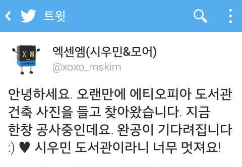 엑센엠 소식 되게 오랜만에 보는 것 같다~~!! 감동적...ㅠㅠ 에티오피아 사람들이 시우민도서관에서 좋은 책 많이 읽고 행복해졌음 좋겠다!!!