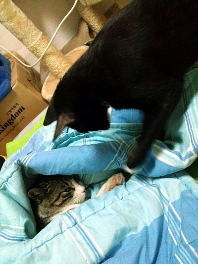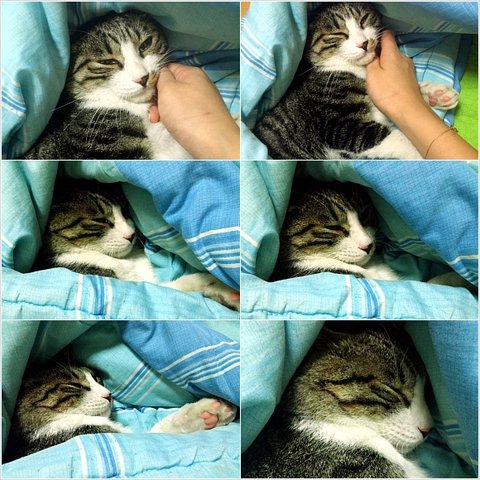 발 다친거도 안쓰럽고 해서 안아서 이불 속에 넣어줬어요,