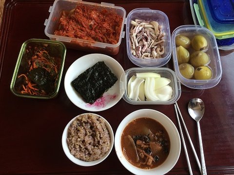 보시면 아시겠지만 한식 위주의 식단이며 국은 오징어와 고동살을 발라서 양파와 같이 넣고 끓인 된장찌게이며 밥은 현미와 잡곡을 섞어서 만든 현미잡곡밥 그리고 양파짱아찌 생야파 김 깻잎짱아찌 오징어 숙회 이렇게 인데요 대충 보면 약간 짜게 먹는거 아닌가요? 라고 생각하실수 있지만 땀을 많이 흘렸기때문에 몸에 염분이 많이 빠져 있는 상태입니다 우리 몸은 항상 일정한 상태를 유지해야하기때문에 즉 항성성을 유지해야함으로 약간의 염분도 섭취 해주셔야 합니다 대신 소량으로 드셔야한다는점 국같은경우도 된장은 짠 음식이에요 그렇기때문에 국물은 먹지 않고 건더기만 건져먹었구요 양파가 많죠 그이유는 양파가 지방분해의 도움을 주기도 하면서 또 지방이 축척되는것을 억제해주는 역할을 하기때문에 양파를 많이 먹었네요 변비에도 좋구요