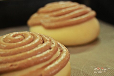 발효빵 위에 바삭한 빵 반죽을 회오리처럼 얹어서 구우면 저런 모양이 나옵니다.