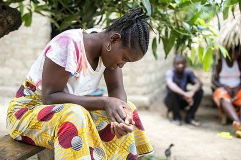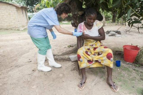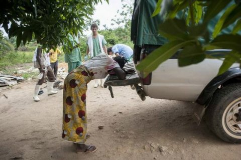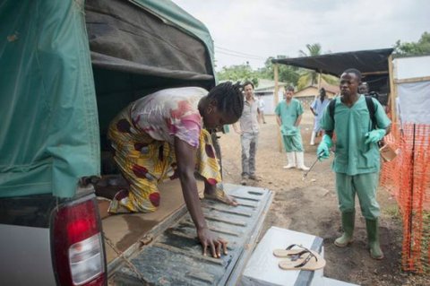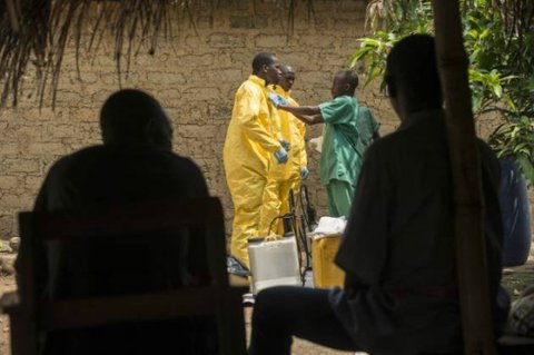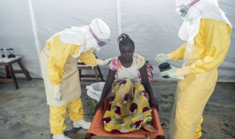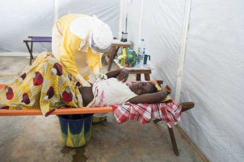 보호 장구를 착용한 의사가 에볼라 감염을 진단하고 있다