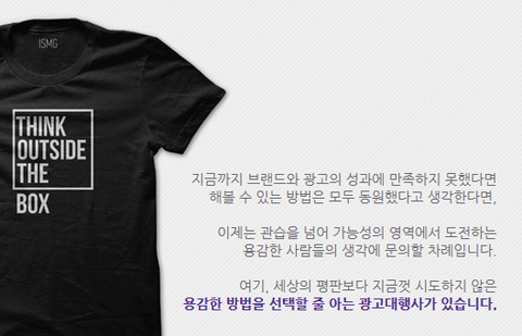 황두연 대표(ISMG 코리아)는 대부분의 사람들이관습의 영역에서 해답을 찾으며 좁은 생각의 영역에서뻔한 문제와 답 사이에 고민하는 하며만약 브랜드와 광고의 성과에 만족하지 못했다면,좋은 관습의 영역에서 벗어나 가능성의 영역이라는 훨씬 더 큰세상에서 지금껏 시도치 않은 혁신의 가능성과 차별화를 통해성공의 가능성을 보고 있습니다!