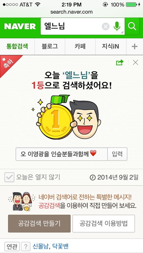 별거아니지만 1등 오오오 평생네이버하면서 살고볼일이네!신몰남 등등치다가 엘느님 연관검색어떠서 쳣는데 엄훠❤️❤️❤️