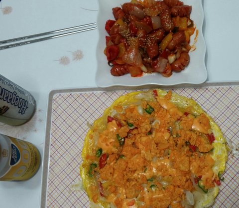 요건 월드컵 때 축구보려고 새벽에 만든 나초치즈오믈렛과 쏘세지 야채볶음이에요~