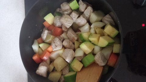 카레는 고기를 따로 데치진 않았구요, 그냥 감자랑 당근이랑 고기랑 첨에 같이 볶아요!