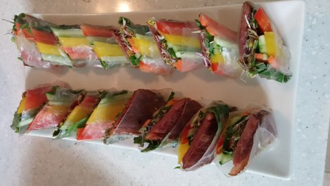 소고기야채말이, 베이컨야채말이, 케이준치킨샐러드, 깻잎참치쌈밥, 유부 초밥이에요!