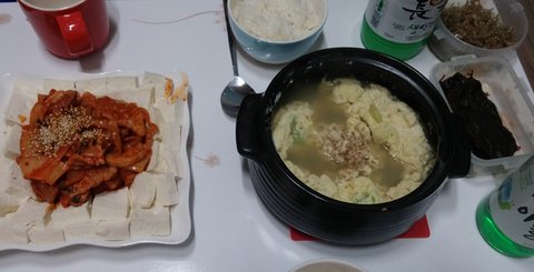 막걸리 안주 발사요. 돼지고기 두부김치와 계란찜이에요.. 계란찜 왜저러지;;