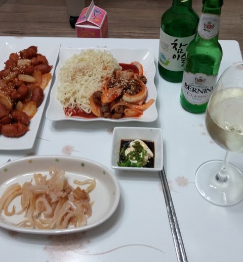 요것은 여러번 등장하는 쏘세지 야채볶음과 골빔면! 그리고 시중에 파는 안주 오징어에요