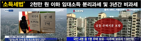 정부는 2천만 원 이하 임대소득에 대해서는 분리과세를 하며, 3년간 세금을 면제하는 <소득세법>을 처리해달라고 요구하고 있습니다.