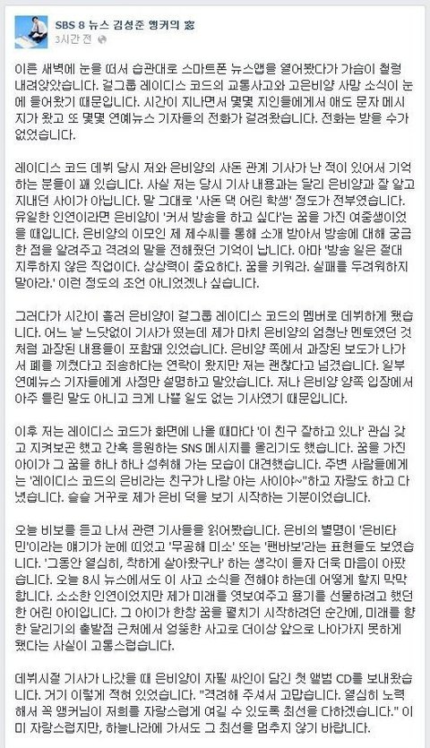 http://pann.nate.com/talk/324120249 -------------- 김성준 앵커, 뉴스서 레이디스코드 은비 언급 “안타까운 사고가 있던 날” http://sports.khan.co.kr/news/sk_index.html?cat=view&art_id=201409032238473&sec_id=540101&pt=nv