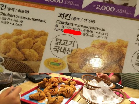 치킨 9조각이라고 써있던 것과는 다른 8조각이었습니다.