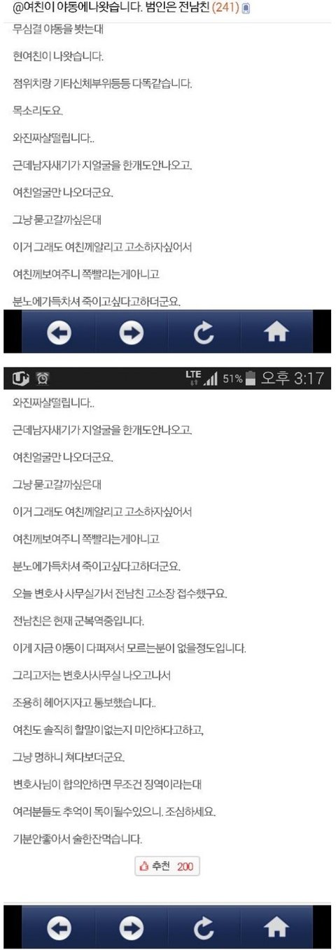 근데 여자가 동의해서 찍었다고 몰아가는 사람들은 뭥미? 솔직히 저게 동의해서 찍은걸로 보임? 동의해서 찍었는데 왜 남자는 하나도 안나오고 여자만 나옴? 몰래 찍힘 당하고 심지어 유포까지 당했는데.. 저걸 몰래찍어서 유포한 쓰레기 남자새끼랑 동급 취급하네? 와.. 진짜 남자들 다 저따위로 생각하는건가? 성기같네.. 내가 저런 일 당한 적은 없지만.. 여기 써놓은 댓글들 보니 소름돋는다. 대체 저 여자는 그런거 당하고.. 유포당해서 전남친한테 화내고 고소까지 한건 좋은데 현남친한테 왜 미안해야 하지? 저 여자는 지금 범죄의 피해자인데.. 대체 왜? 내가 더러운 똥을 밟아서 미안합니다. 내가 범죄를 당해서 미안합니다. 뭐 이런거? 진짜 사고방식들이 이해가 안된다. 앞으로 무슨 범죄든 범죄피해자는 남자친구한테 미안해하세요 여러분. 와... 진짜 멋진 세상이네요.