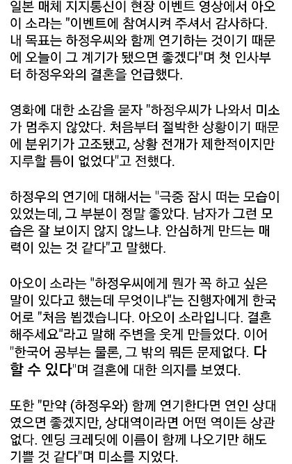 하정우씨의 열렬팬이고 공개청혼함. 하정우씨에게 뭐든 다 해주겠다는데 해준다는게 뭔지 궁금함