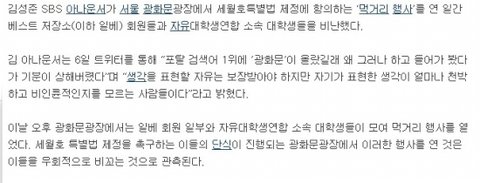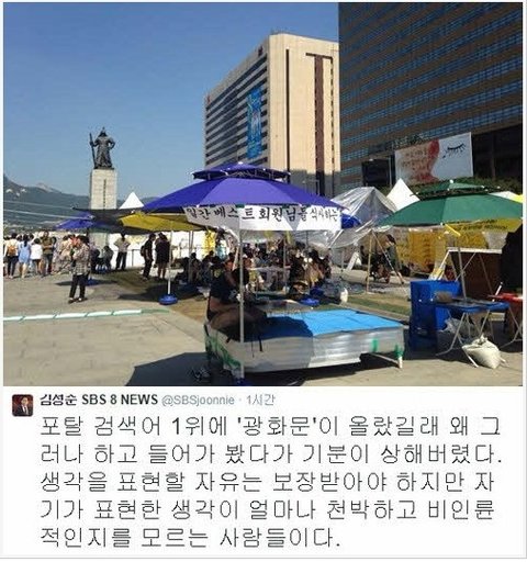 난 지금 세월호 전혀 안타깝지 않아; 그리고 저렇게 라도 해야 저기 불법으로 천 쳐놓고 잇는 유가족들이 집에 쳐들어가지 광화문이 세월호 유가족 들 꺼야 ? 너희 저렇게 할 배짱이라도 있냐 무슨 뭐만하면 일베충 욕이야 개념있는짓 했고만