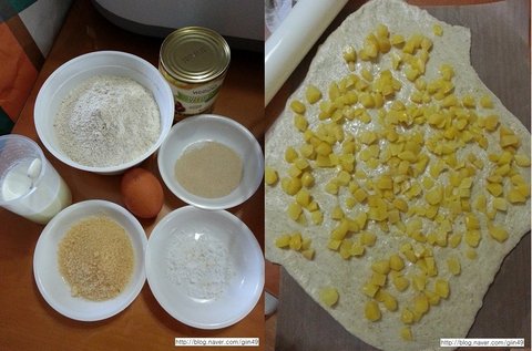 재료는 백미가루 150, 이스트 5 , 설탕 18, 소금 4 , 버터 15, 우유 70, 계란 반개, 소보루 , 앙금 이구요.