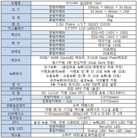아이나비 플래그십 블랙박스의 QXD900 View 제품사양