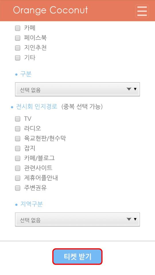 간단한 설문조사 후 티켓받기를 누르면
