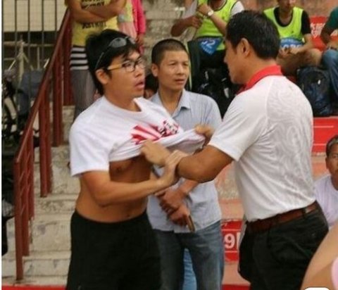 그가 입고 있던 티셔츠를 찢어 발로 밟았다