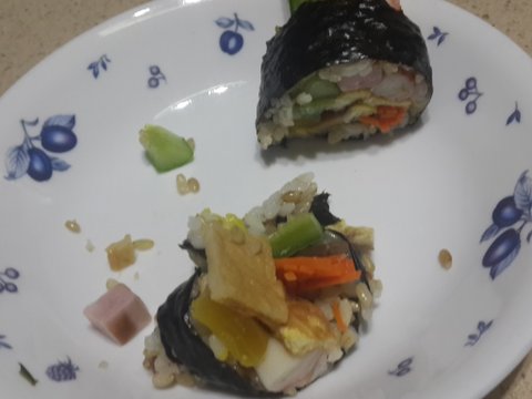 지가 존 나 신의칼이라면서 김밥 꼬투리남은걸 반으로 잘라서 편하게 먹게해주겠대서 ㅇㅇ해봐했는데