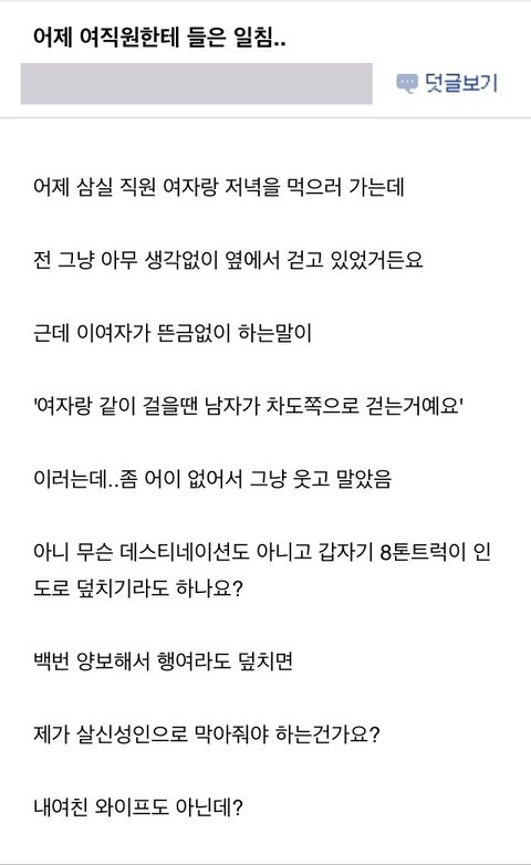 여자로 보여야말이죠ㅡ한방 먹였어야지 웃기지도 않네 남자는 목숨이 몇개씩되냐
