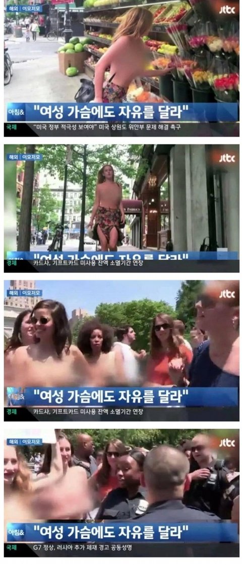 이들의 격렬한 '노출 의지'에 경찰까지 출동했습니다 뉴욕에선 1992년부터 여성 상의 탈의가 합법화돼 있어서 경찰도 이들을 말리진 못했는데요