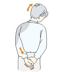 왼팔을 등 뒤로 늘어뜨린 다음 오른손으로 왼쪽 팔목을 잡아 당긴다