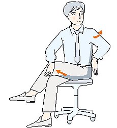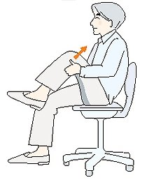 의자에 앉아 양손으로 왼쪽 다리의 무릎 뒤쪽을 잡고 천천히 당긴다