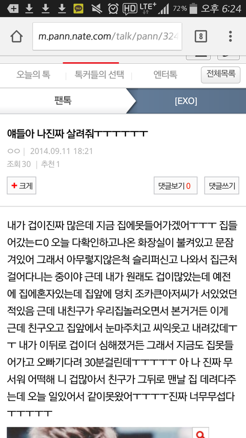 집에 들어가 그냥? 진짜 무서워서 못들어가겠는데 오빠도 오고있는중이긴한데 아직좀 있어야되고 아 암튼 미치겠다 여기저기 걸어다니는중있데 몇십분째 이러니 다리도 아프고 살려줘 진짜ㅜㅜㅜㅜㅜ 나어떡해야되