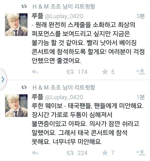 ...............ㅠㅠ 루한이 생각보다 더 많이 몸상태가 안좋은가봐ㅠㅠ 에효ㅠㅠㅠㅠ 루한아ㅠㅠㅠ 푹 쉬면서 너무 걱정하지말고 몸조리 잘 했으면 좋겠다ㅠㅠㅠ 루한아ㅠㅠ