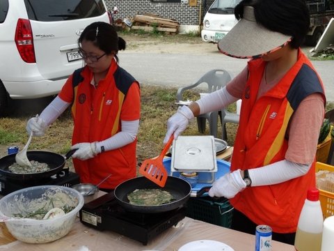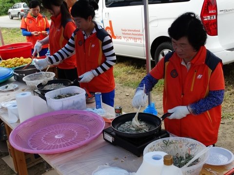 그날 마침 경기방송에서 ‘이상우의 팝콘 월간스페셜’ 사랑의 집고치기, 우리동네 콘서트가 열려 더욱 더 큰 행사가 되었다. 이에 우리 대진국제자원봉사단에서는 다과상과 해물전을 준비하였고, 동네 주민분들은 따뜻한 밥과 국을 마련하여 행사에 참여한 관계자 및 봉사자들을 대접하였다.
