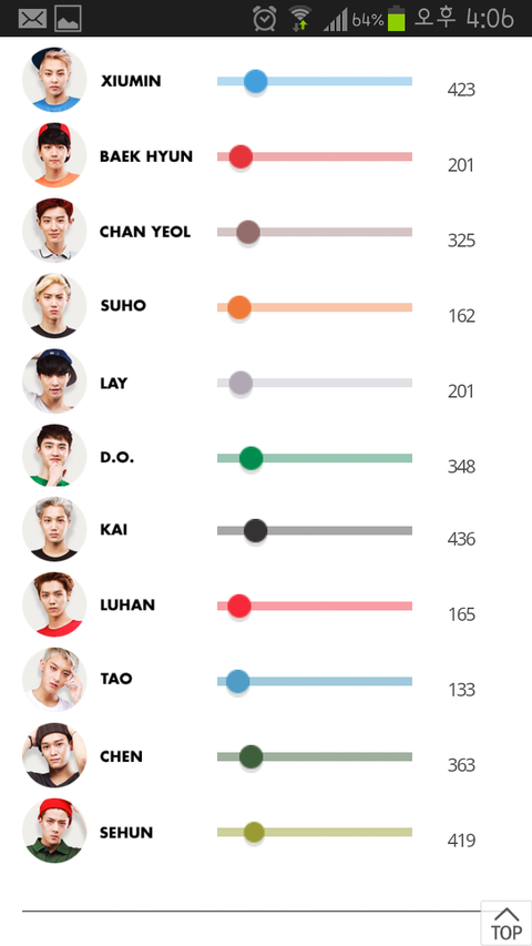 여기 투표글 올라온 후, 시우민 무섭게 치고 올라옴 (현재 2위, 1위는 시간문제ㅋ) 세훈이도 만만치 않음(세훈팬들 조금 더 분발하면 2위 가능) 카이는 약간 주춤(카이팬들 뭐하나ㅋ)... 암튼 지켜보는 재미가 솔솔~~