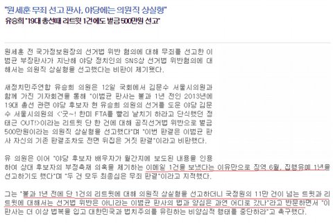 http://pann.nate.com/talk/324194408 --------------- “법치주의 죽었다” … 현직 부장판사 ‘원세훈 판결’ 정면비판 김동진 판사, 법원 통신망에 “선거법 무죄는 궤변” 대법, 정치적 중립 어겼다며 3시간만에 직권 삭제 http://www.hani.co.kr/arti/society/society_general/654981.html -------------- 현직 부장판사, “원세훈 무죄 궤변, 법치주의는 죽었다” “현 정권은 패도정치…승진 앞둔 입신영달 사심 판결” http://www.mediaus.co.kr/news/articleView.html?idxno=44158