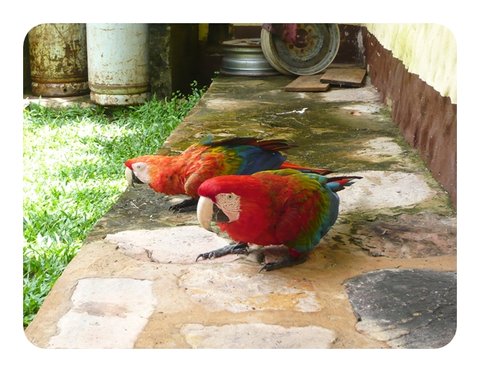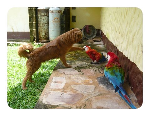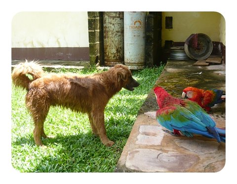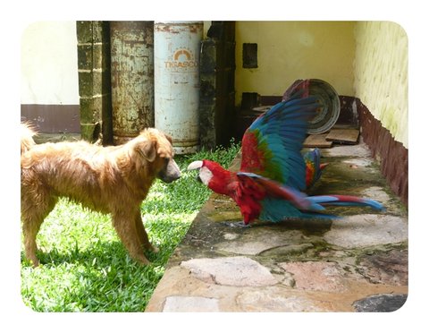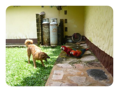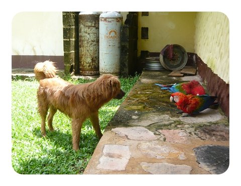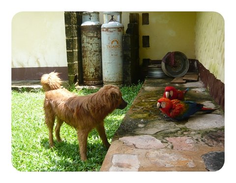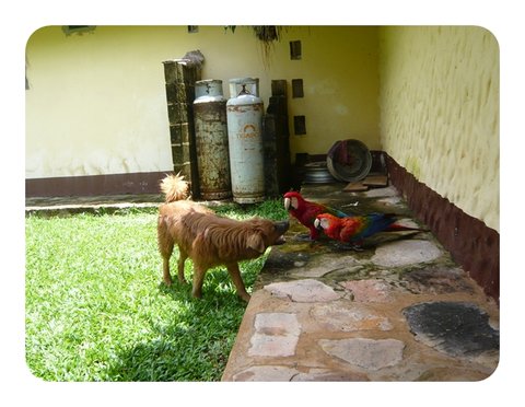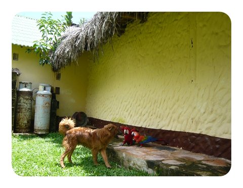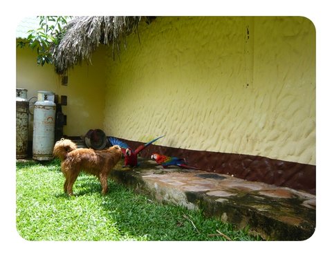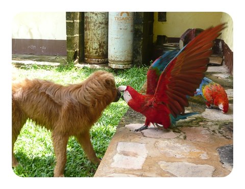 Canaima(까나이마)국립공원 내 Angel 폭포 관광객이 상주하는 마을 숙소근처에서 우연히 반려견과 Papagayo(빠빠가요)라고 하는 앵무새류와 다툼을 목격했습니다.