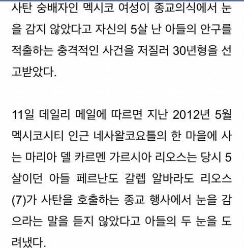 http://pann.nate.com/talk/324226147 ----------- 5살난 아들 눈 뽑은 멕시코 여성, 징역 30년 http://news.khan.co.kr/kh_news/khan_art_view.html?artid=201409131713201&code=970201