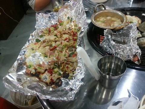 기다리는대.. 처음에는 저 은박지 위에 조개랑 치즈랑 막 섞여있는걸 불 위에 올려주는거에요.