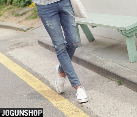 1. 워싱들어간 슬림한 청바지에 흰색 운동화