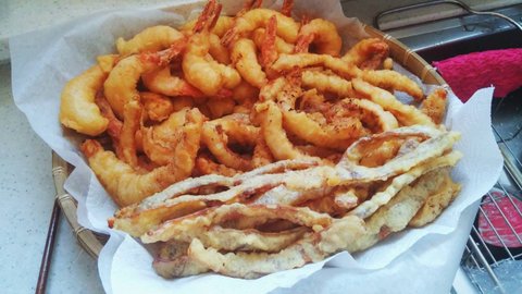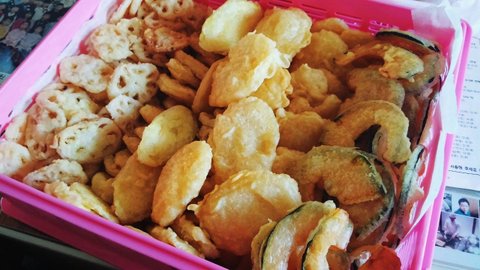 감자, 고구마, 단호박, 연근, 오징어, 쥐포, 새우까지!! 무려 4시간을 기름과 사투했습니다!!