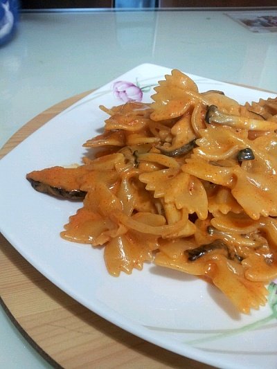 나비모양으로 생긴 파르팔레를 데친 다음에 버섯과 양파를 넣어 만들었어요.