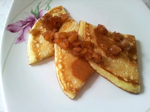 애플파이하고 남은 졸인 사과를 얹은 핫케이크