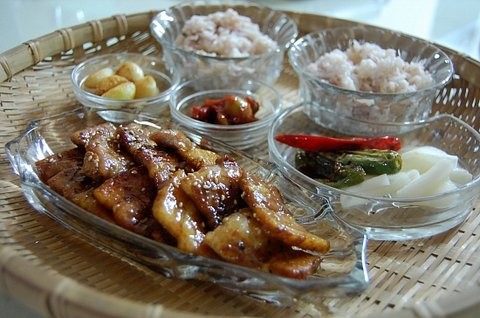 삼겹살을 데리야끼 소스에 재워 노릇노릇하게 구워주고 구운 마늘과 고추,