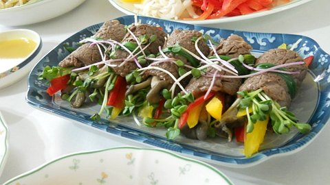 얇게 저민 소고기를 구워낸 다음에 버섯, 파프리카, 무순을 넣어 말아낸 소고기 편채말이!